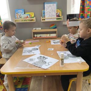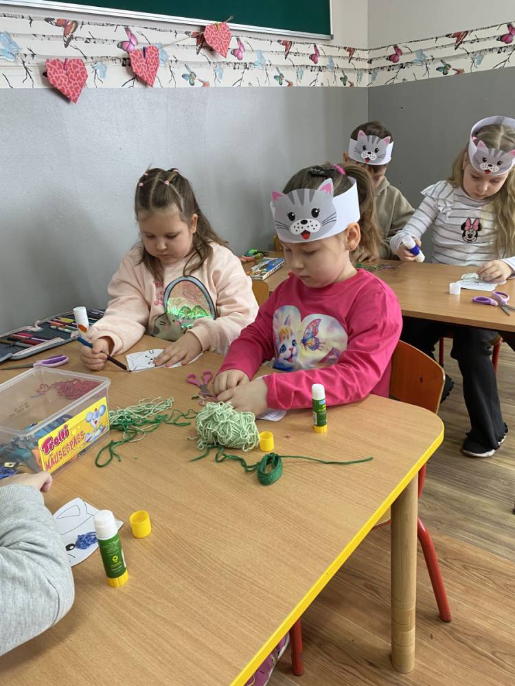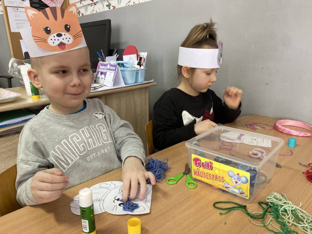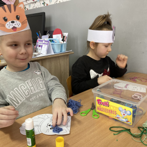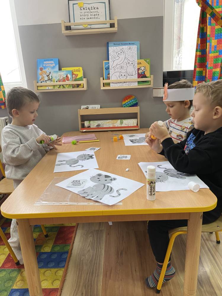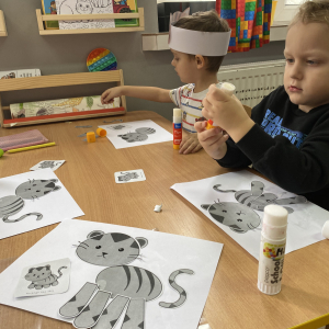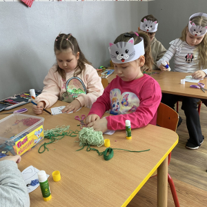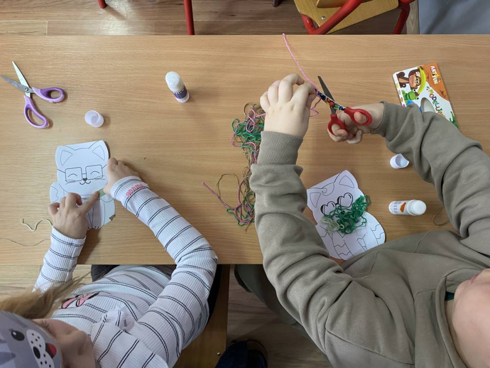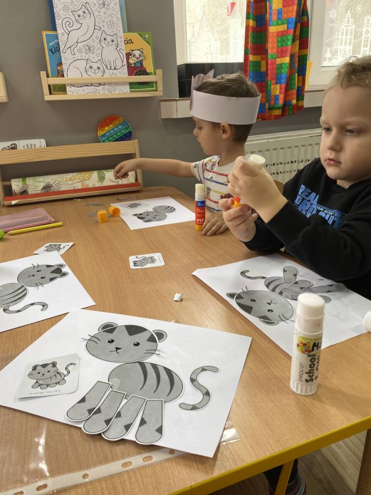 Podczas zajęć plastycznych dzieci wykonały urocze kotki z włóczki, rozwijając swoją kreatywność i zdolności manualne. Nie zabrakło także ciekawostek o życiu kotów – dzieci dowiedziały się, jak koty się porozumiewają, dlaczego mruczą oraz jak dbają o swoją czystość. Poznaliśmy również budowę kota i jego charakterystyczne cechy.